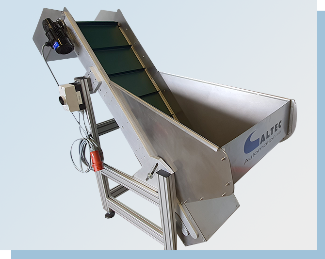 Unsere Bandbunker (Schrägförderer) eignen sich zur Bevorratung von Werkstücken und bauen auf hochwertigem Qualitäts-Aluminiumprofilen auf. Die Auswahl der Fördergurte richtet sich nach den zu fördernden Teilen.
